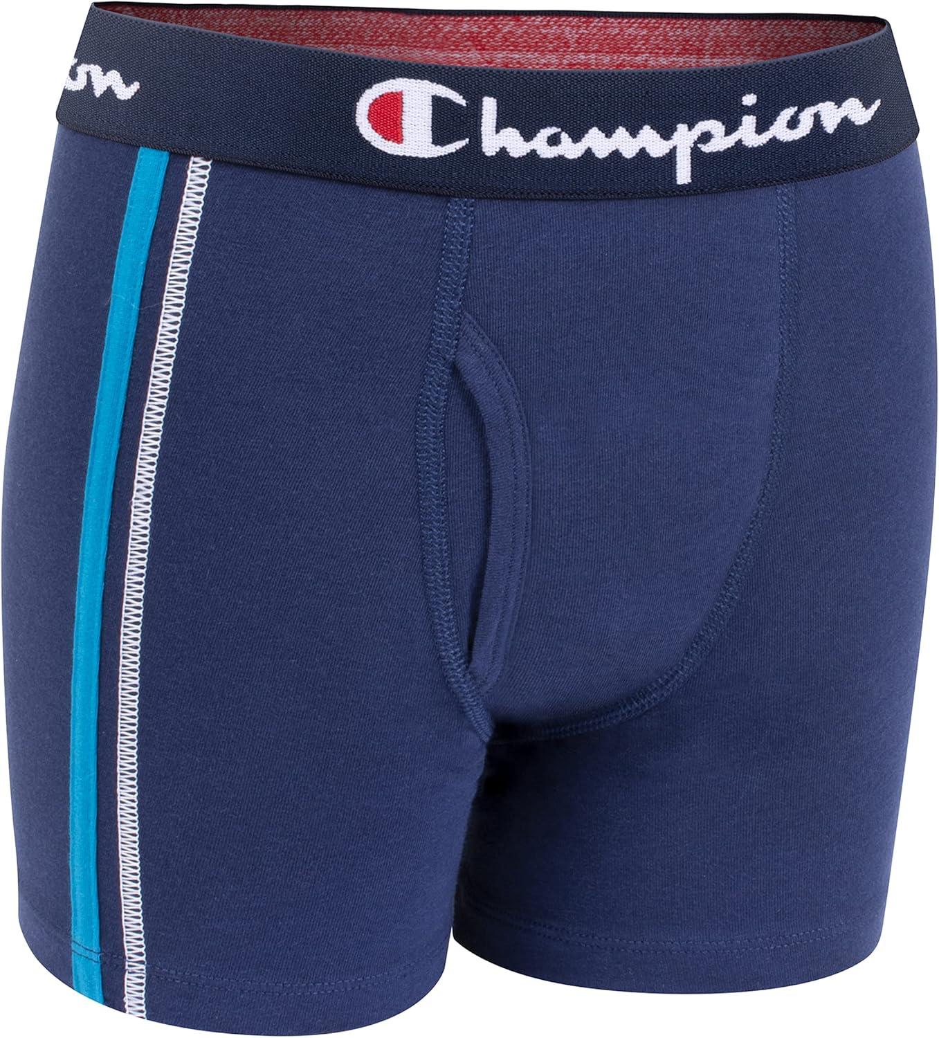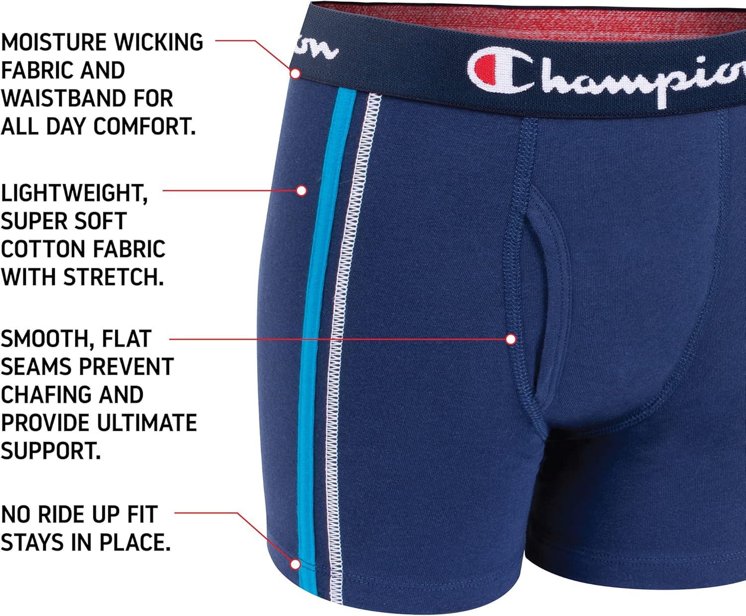 Let your favorite champion express himself with cotton stretch boxer briefs for boys that bring the comfort – and the style too. This boys’ underwear is available in a four-pack of assorted colors and prints that boast sporty piping and exposed, logo-branded waistbands. Crafted from a cotton-rich blend that contains just the right amount of spandex, these Champion® boys’ boxer briefs are made to stretch and move when he does. Moisture-wicking technology in the underpants and the waistband takes moisture away from the skin, keeping him cooler and drier as the day goes on. Smooth, flat seams reduce chafing while hemmed legs are designed to stay in place and prevent ride-ups.